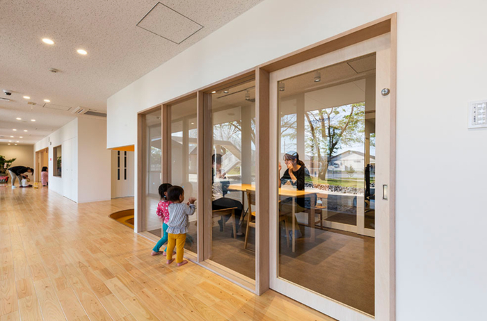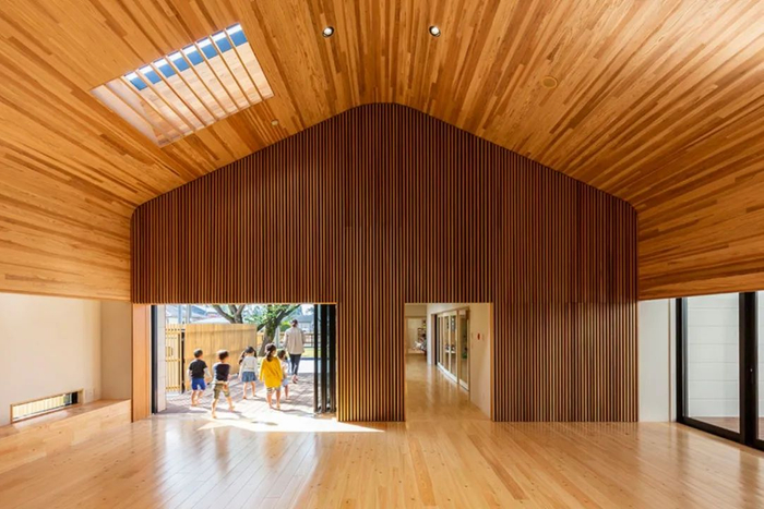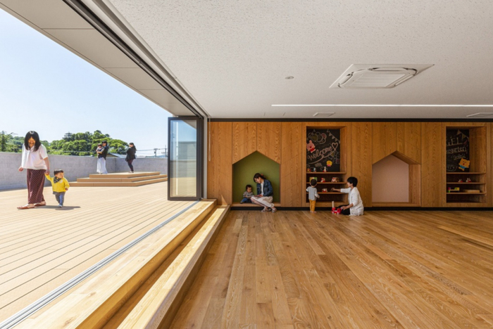 第三是督促孩子对外界有兴趣。主房间向外开放,门可以完全打开,屋顶向外变高变宽。所以风和光是自然进入的。把大自然带到室内会让孩子们对户外产生兴趣,并促使他们去户外玩耍。透过门和窗户,可以看到好几种树。在任何季节,孩子们都能在他们的日常生活中感受到大自然的变化,例如结出的果实和落叶。这会培养他们的好奇心和敏感性。