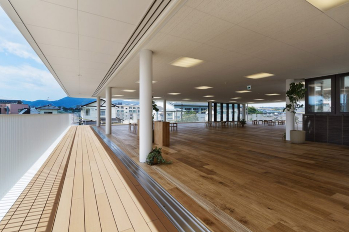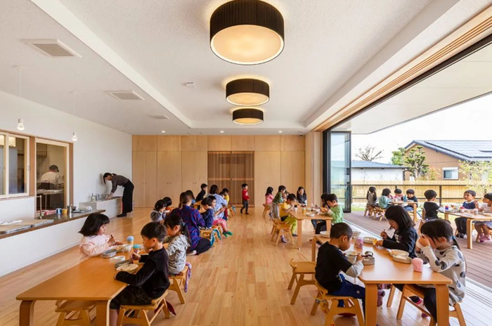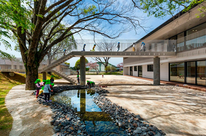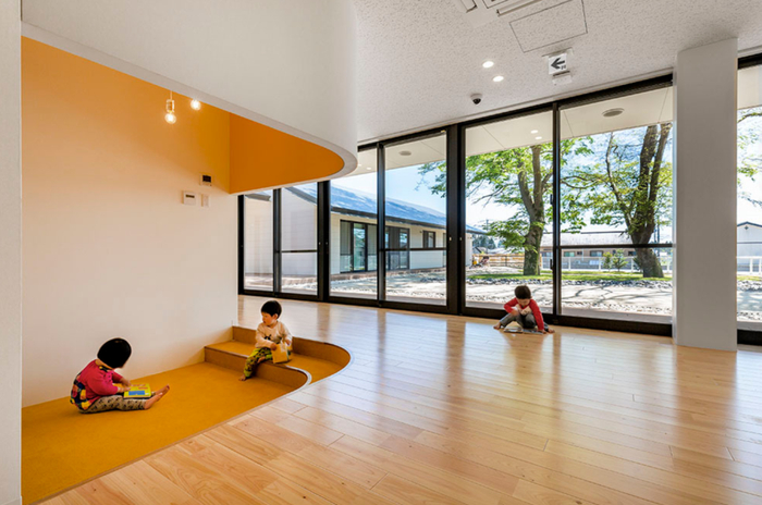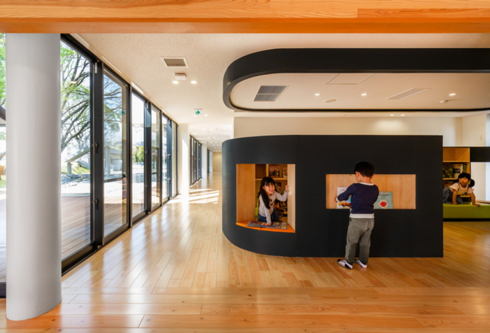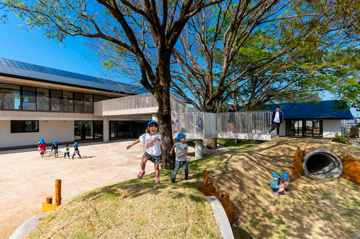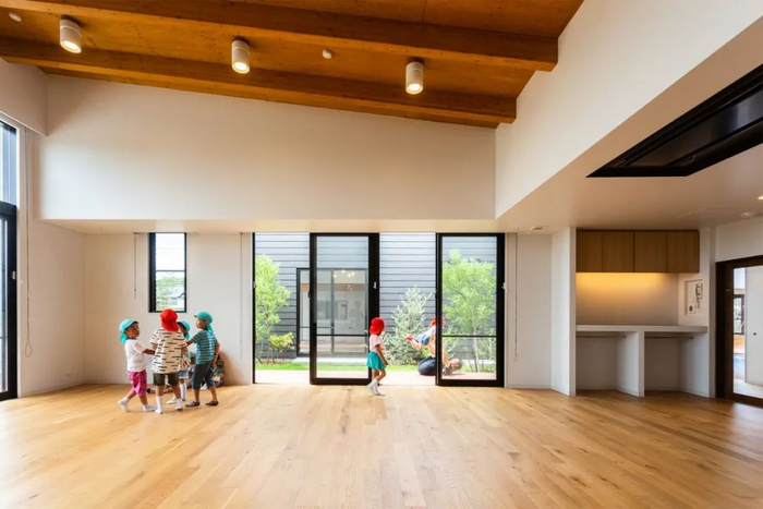 项目位于日本熊本县。为了获取更多可以自由穿行的、能与自然环境接触的活动空间,设计师为幼儿园打造了一个灵活可变的平面布局。