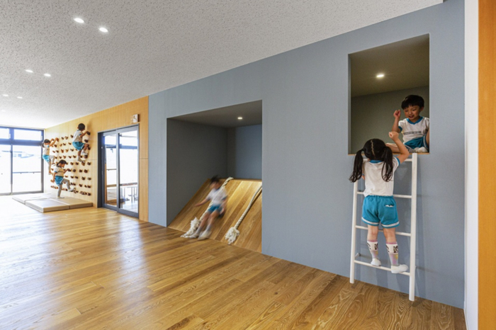 项目是福井县福井市幼托连贯制园舍的改造项目,这里包含了很多利于拓展孩子们游戏的要素。设计者希望在足羽山的自然环境中所诞生的游戏动作在园舍内也能产生。