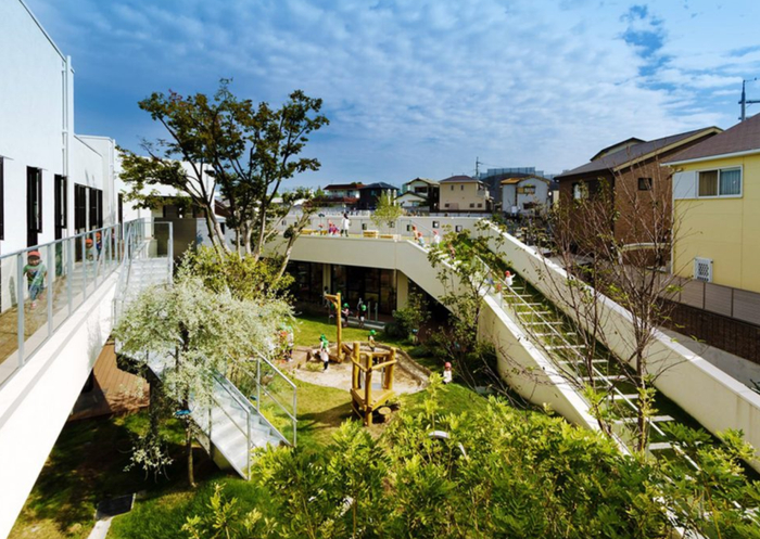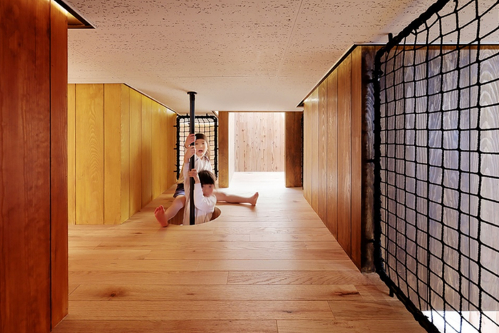 孩子们会在追逐奔跑之中,被这些设施引导,或者跑上屋顶,或者跑下楼梯,就这样不断的在庭院和屋顶之间来回循环,最终孩子们的运动量实现了大幅的提升。
