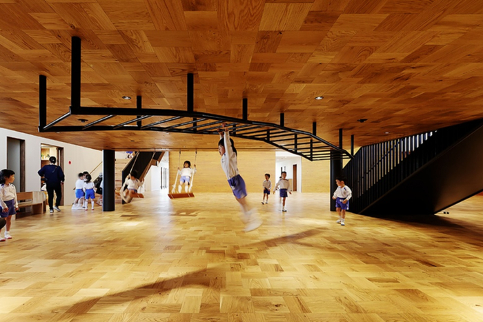 而幼儿园屋顶也是“极简”风格的,温柔的原木色贯穿了整个校园。除了必不可少的护栏以外,没有任何其他幼儿园常见的娱乐设施,更不存在什么花花绿绿的玩具乐园。