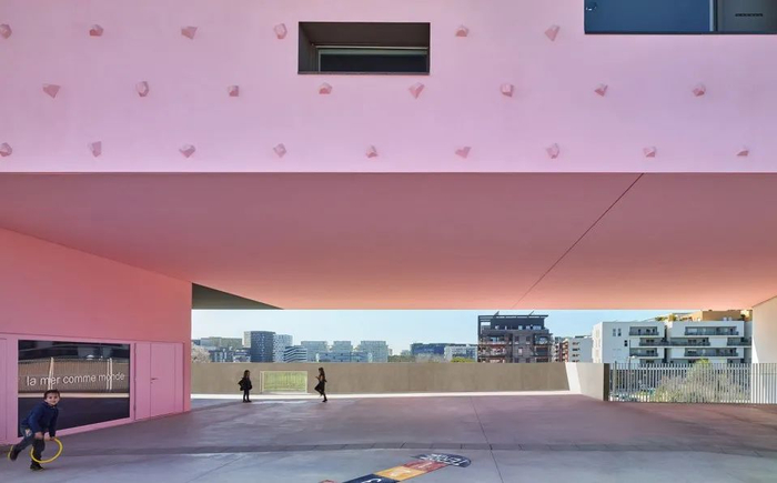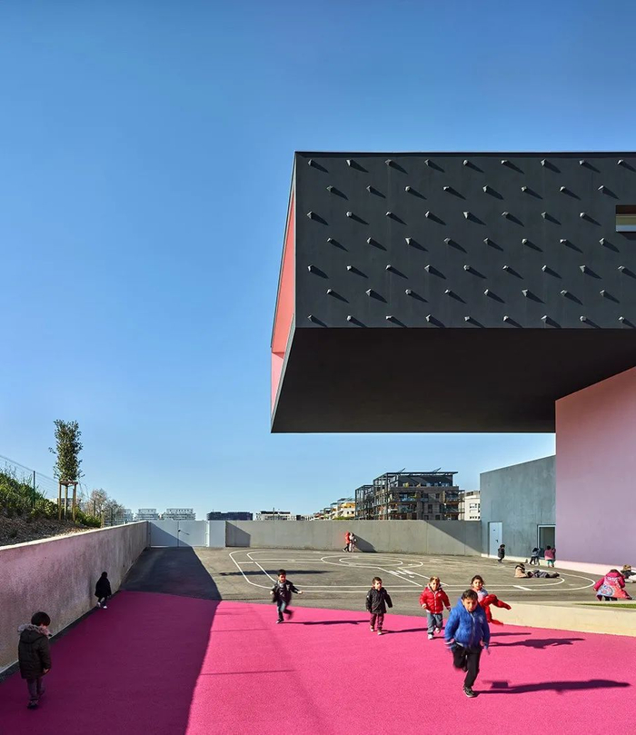颜色、材质各不相同的数个体块扭转交错,如积木般堆叠在一起,部分体量悬挑于活动场地之上,为孩子们遮挡风雨和阳光。