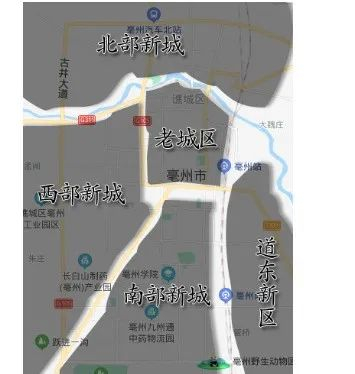 亳州市区大致可分为五个板块——老城区、北部新城、南部新城、道东新区、西部新区。具体来说,涡河以北为北部新城,涡河以南、药王大道以东、紫苑路以北是亳州老城区,紫苑路南面以铁道为界,西面直至105国道为南部新区,东面为道东新区,药王大道以西为西部新区。