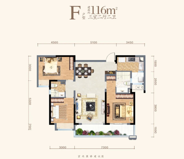 以116㎡户型为例,该产品为三室二厅二卫,具备「户型方正、无浪费空间、五面空间朝南、7.3米超宽阳台、正对中庭景观」五大优势,总价240万元左右;136㎡户型总价280万元左右。
