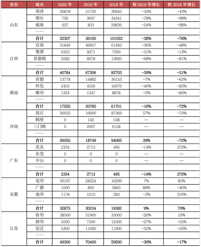 传统棚改大省山东、河南、新疆等计划开工量更是显著缩量。以全国棚改第一大省山东为例,计划开工量由2018年67.2万套持续下滑至2020年14.3万套,累计降幅多达79%,棚改市场规模显著缩量。