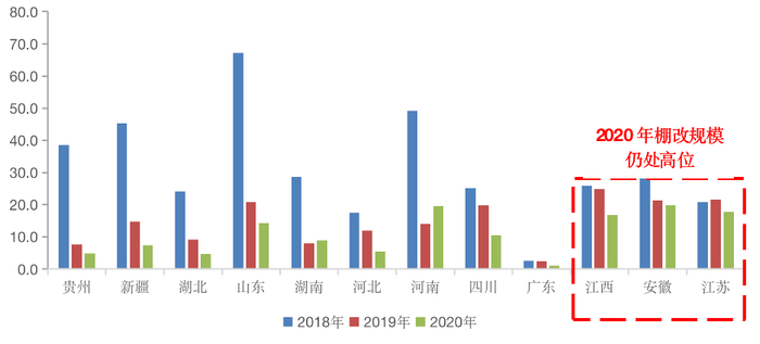 江苏、安徽和江西等棚改市场规模整体仍处高位。例如江苏省,2020年棚改计划开工17.7万套,较2018年高峰期下降18%。