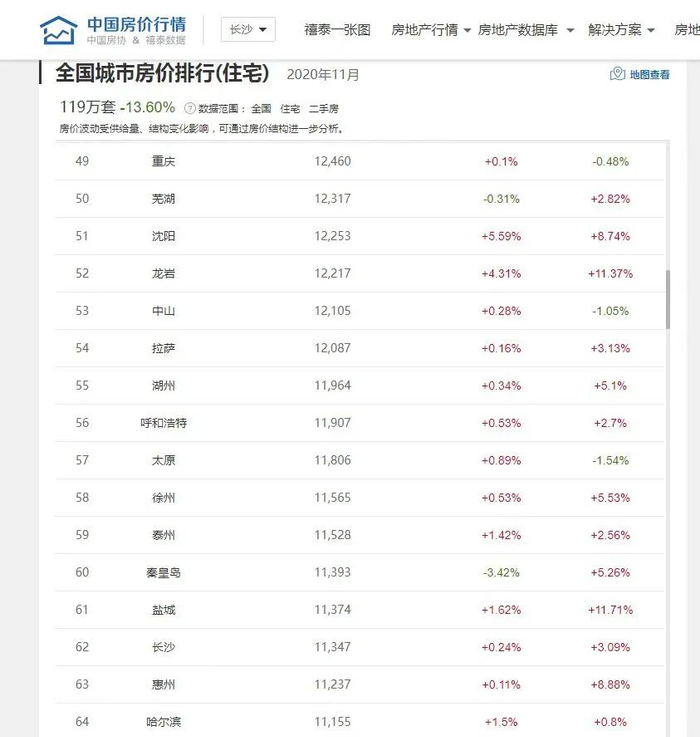 中国房协与禧泰数据合作发布的中国房价行情平台数据显示,今年11月,长沙住宅均价11347元/平方米,接近沈阳、重庆等城市房价水平。