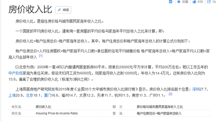 房价收入比,是指家庭住房总价与居民家庭可支配收入的比值。百度百科有关房价收入比的计算公式为,每户住房总价=人均住房面积×每户家庭平均人口数×单位面积住宅平均销售价格,每户家庭年总收入=每户家庭平均人口数×家庭人均全部年收入。