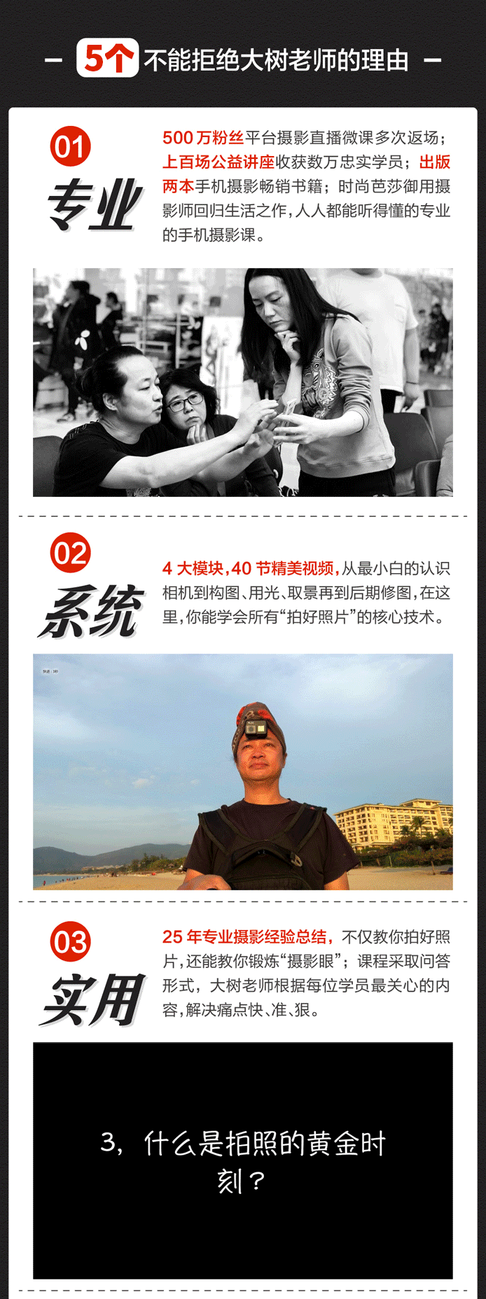 树爸将28年来在摄影这件事上总结的:拍摄思路、技巧、简单实用的小窍门,从最小白的认识手机相机、到构图、用光、取景再到后期修图,全面教你成为手机摄影高手。