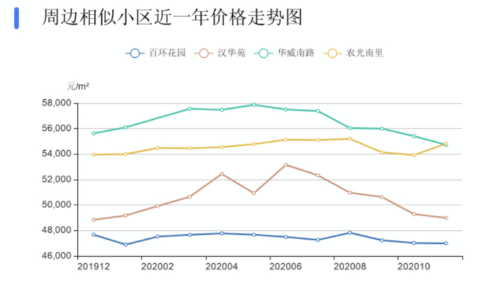 双井这个片区都是前几年大涨的区域,2019-2020是横盘调整的状态,你会发现百环花园的房价走势在大周期中房价表现平稳,相对其他几个小区抗跌性较强。