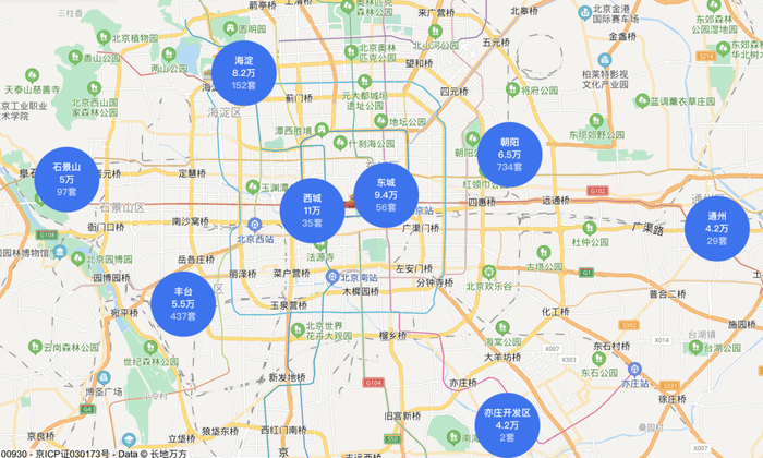 从图中可以看到达到标准房源并不多,尤其是核心区东城区和西城区房源仅是十位数。这是要求房龄在5-15年之间的结果,如果不设房龄条件,房源可提高一倍。