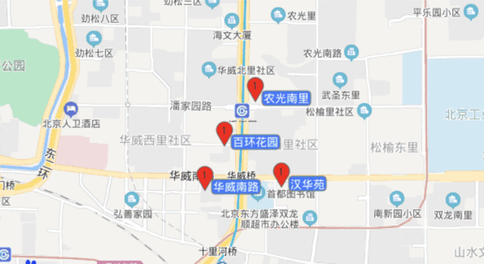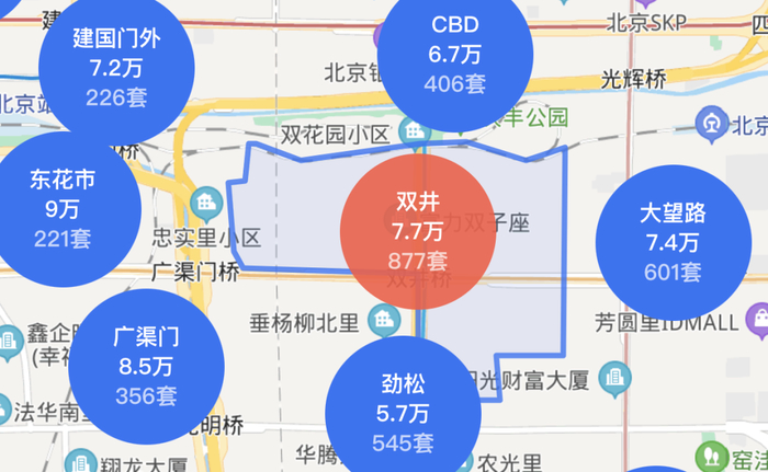 接下来我会围绕着地铁站,在地图上进行搜寻,发现地铁沿线距离国贸不远的双井片区中百环花园、华腾园、汉华苑的价格都可以被覆盖到。
