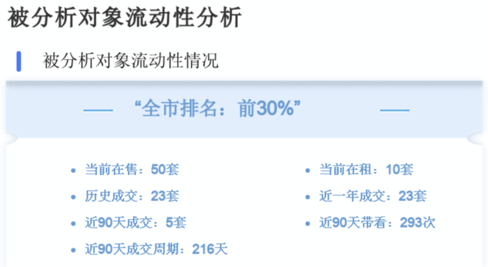 流动性的意思是,在相同的时间内,小区各自的成交量是多少。相互比对,例如百花家园近一年成交23套,其他的小区最多16套,最低成交1套。