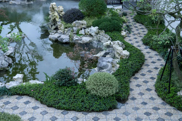 比如重庆融创桃花源园林的“花街铺地”,它本是苏州园林营造八大作里的“土作”,荟萃了水波纹、十字海棠纹、冰裂纹、龟背纹、灯笼纹等多种纹样,美不胜收。但真正要做出来却是难度极高。即使非物质遗产资深匠人,一天也只能铺2个平方米!