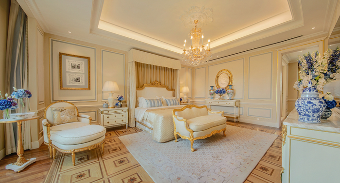 从沙发上站起来,一个空间一个空间地踱过,客厅、餐厅、厨房、卧室、影音室、酒吧、泳池……每一个空间的呈现,让人完全忘记了所谓的格局与时间,华丽的大理石铺陈、手工描绘的金色门廊线条、世界各地搜罗而来精心选配的室内陈设……