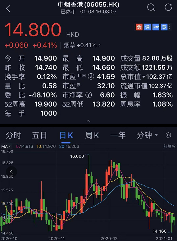 2019年6月12日,中烟香港在港交所上市,发行价为4.88港元。据介绍中烟香港成立于2004年,总部设在中国香港。为中烟国际负责资本市场运作和国际业务拓展的制定境外平台。而其母公司中国烟草总公司连续三年税利总额破万亿元人民币,盈利能力另人惊叹。