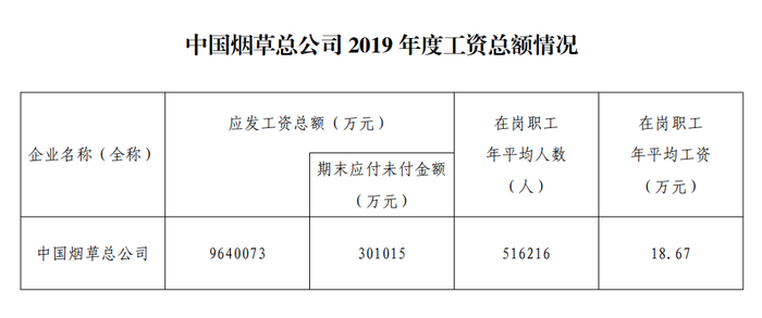 1月8日,财政部网站披露。财政部经济建设司公布中国烟草总公司2019年度工资总额情况。数据显示,2019年度中国烟草总公司应发未发金额964亿元,期末应付未付金额30.1亿元,在岗职工年平均人数51.6万人,在岗职工年平均工资18.67万元。