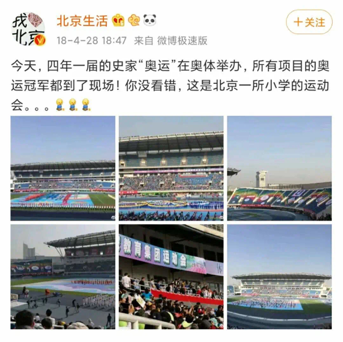 甚至还有小学把校运会开到了鸟巢,请奥委会副主席宣布开幕,央视主持人担任解说,奥运冠军到场为小朋友们加油助威。