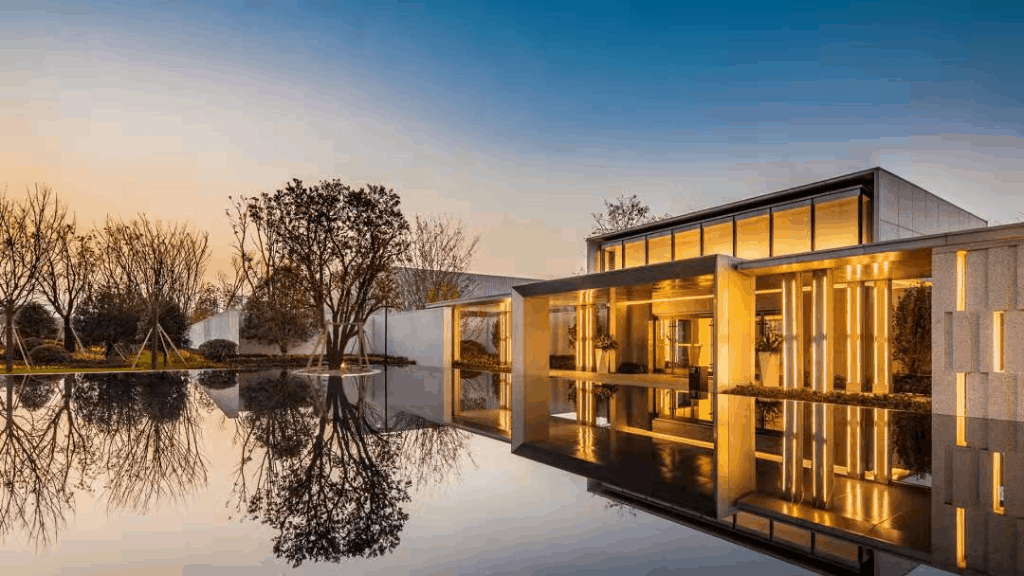 合肥祥生·云境系的美学生活馆,以北雁湖的水面和飞翔的大雁为灵感,通过大面积玻璃幕墙,将建筑完美融入自然之境。