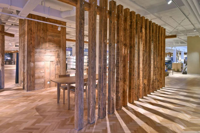 该旗舰店内的部分材料来自丹麦多个百年老旧建筑的的回收木材与砖块:例如最初建于1910年的国家医院大楼、位于哥本哈根郊外的老工厂和Kastrup机场等。旗舰店的墙壁采用特殊的生态石膏制成——这种石膏由100%可回收的材料制成,结合日式传统的安装工艺,形容逼真。