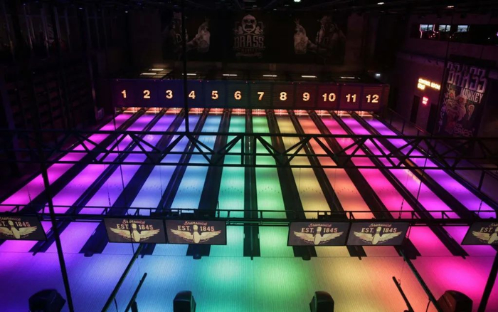 以工业风搭配霓虹灯招牌设计的酒吧非常炫酷,同时设有一间大型保龄球馆,共12条保龄球道,整体空间感受非常时尚;