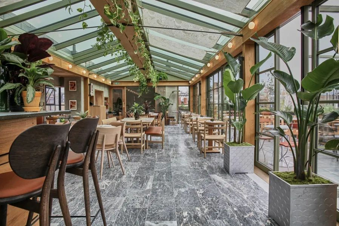 顶层是一个可容纳130个座位的酒吧和餐厅屋顶花园,带有可完全伸缩的电动玻璃屋顶,四季皆宜。