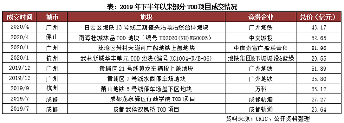 从2019年下半年以来的TOD地块情况来,成交总价均不低,甚至近百亿。例如,今年4月中信泰富广船联合体拿下广州地铁11号线地铁上盖地块,总价高达81.96亿元,折合楼面价约37216元/平方米,溢价率达45%,该地块创造了广州新的总价地王,将打造125万平方米的TOD城市综合体。在高总价门槛下,竞拍方需要具备一定的资金实力。
