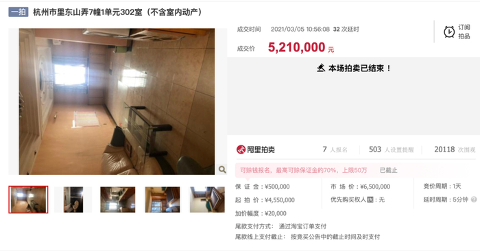 3月5日10时56分,阿里法拍的平台上,一套位于杭州里东山弄的法拍房落锤成交。
