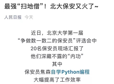 前几天人民日报还发文,称赞北大保安员焦森自学Python编程。