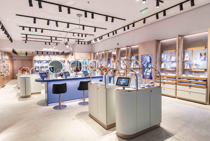 ▶ 周大福 “礼”系列店铺为北京独家体验店,将提供全新理念及主题场景,以礼物盒为创意灵感,结合北京文化元素进行店铺设计,用温暖的暖色系作为店铺主色调,产品展示则采用了开放式柜面陈设系列,将所有首饰柜都设计成了礼物盒,打造场景化开放式购物空间,让客人近距离欣赏、搭配喜欢的饰品,分享由礼物带来的喜悦;