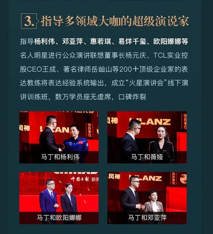 指导过薇娅、杨利伟、邓亚萍、惠若琪、易烊千玺、欧阳娜娜等众多名人公众演讲。