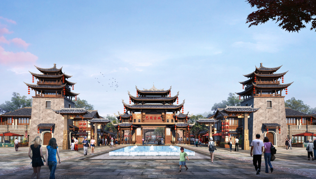 据披露资料,“巴国古城”项目占地700余亩,涉及五星级酒店、城楼、戏台、禅院、古塔、楼阁等古城公共建筑,商业街区、民宿酒店等古城商业建筑,以及中央广场、小广场、沿街夜景等场景建筑,总建筑体量91万方。