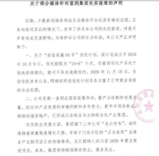去年11月份,坊间曝出蓝润一只信托融资产品申请延长6个月,实为违约后无奈妥协之举,不久被蓝润官方矢口否认,却透射出其资金链紧张的一面。