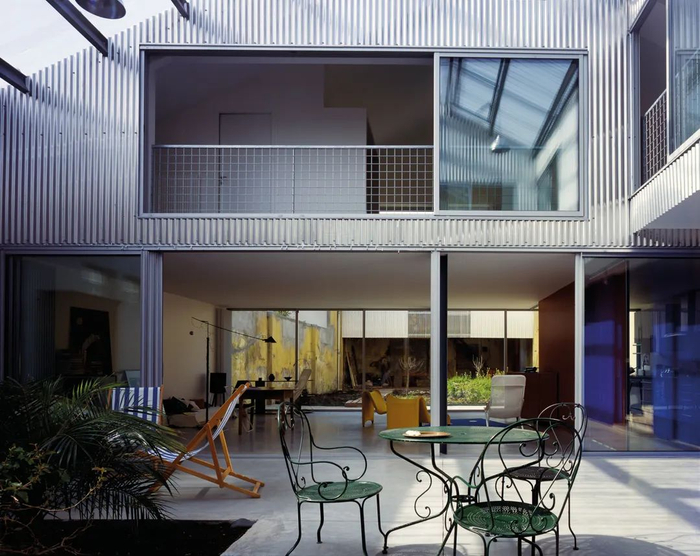 这座私人住宅由一间无自然采光的厂房改造而成。部分屋顶被替换为透明的聚碳酸酯板,形成明亮的内庭院,阳光可以洒满整间屋子。内部的开放布局,加上可整面推拉的宽大落地窗和作为墙面的移门,为建筑提供了极其通透的视野,内外庭院的美景彼此呼应,一览无遗。