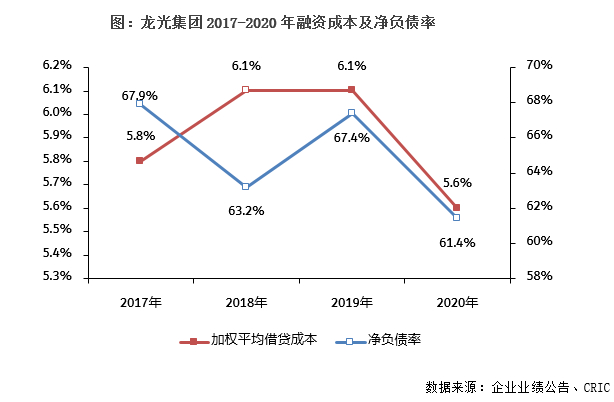 年内,龙光不断探索多元化的低成本融资管道,新增借贷平均成本为5.45%,年末加权平均借贷成本为5.6%,较2019年末6.1%继续下降0.5个百分点,成本优势显著,展现出较强的融资能力。截至报告期末,龙光共持有现金428.7亿元,总有息负债为801.4亿元,并且从财务结构来看,不仅三条红线全部达标,且各项指标进一步优化,其中现金短债比为1.8;净负债率较2019年末显著下降6个百分点至61.4%;剔除预收款后的资产负债率降至69.8%,该指标2019年末是76.1%。在“三条红线”管控下,绿色档房企在融资、投资、风险控制等方面都具备更强的竞争力,可以更大程度地挖掘市场机会,进一步强化自身优势。
