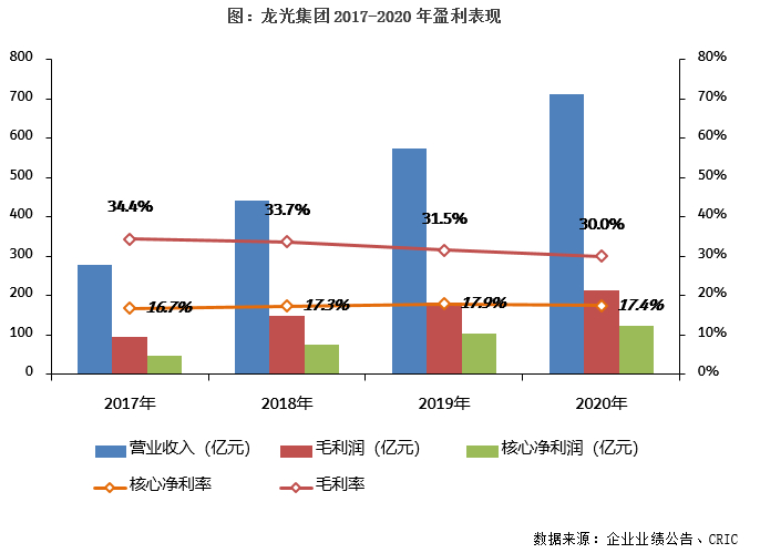 【归母核心净利润达120.4亿元,盈利水平保持在行业高水平】2020年,龙光的营收与利润规模稳步增长,全年总营收710.8亿元,同比增长23.7%;实现毛利润213.3亿元、净利润133.7亿元,分别同比增长17.6%、15.7%;归母核心净利润也同比上升20.1%至120.4亿元。毛利率为30.0%,净利率18.8%,核心净利率为17.4%,保持在行业高水平,这主要得益于龙光以前低成本的土储以及高盈利性的城市更新业务。