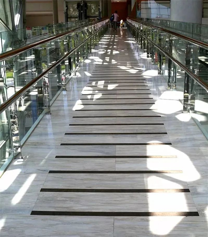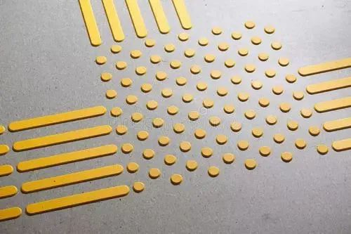 重视盲文地砖运用, 条状凸起和块状凸起的可触觉地面,设置引导标志,对于身体残疾者不能通过的路, 要有预先告知标志;