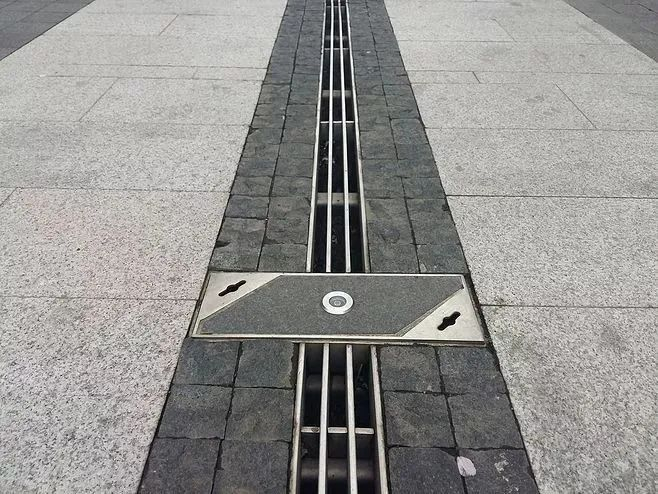 盲道连接示意:避开井盖以及其他危险设施,路上的排水, 集水槽应做好加盖处理,保证地面完整、平坦