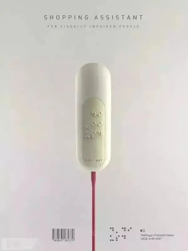 智能购物助手,也是为视障人群设计的一款智能购物助手创意产品。它的功能十分强大,像一个条形码扫描枪,可以通过对条形码的读取来为使用者在盲文的显示区显示出产品的相关信息,例如产品名称、总量、大小和价格等,甚至是此产品在商场内的货架位置信息等,适用于购物中心的超市以及商户店铺内。