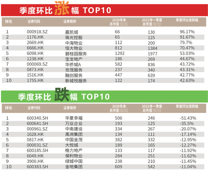从涨跌情况来看,2021年一季度环比涨幅前十的企业分别为嘉凯城、珠光控股、中海物业、恒大物业、碧桂园服务、宝龙地产、华侨城A、世茂服务、融创服务以及新城悦服务,其中一季度环比涨幅最高的是嘉凯城,涨幅为96.17%。