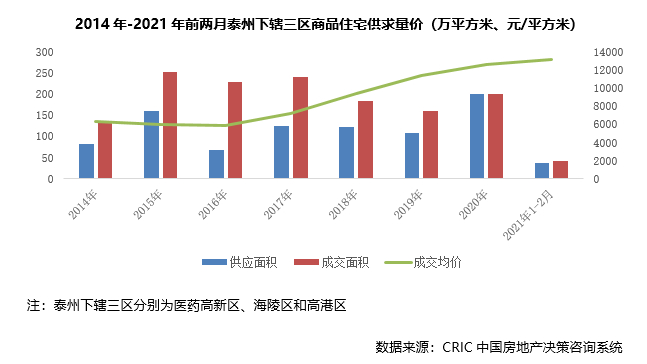 2021年,泰州市场热度不减,成交呈加速上涨态势,前2月下辖三区累计成交43万平方米,较2019年同期增长97%。