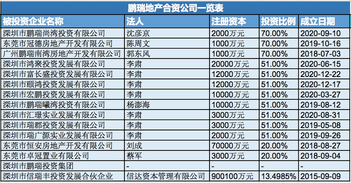 这7家企业注册资本从2000万元至2亿元不等,成立时间在2019年以后,并由鹏瑞地产持股51%。而剩下的49%股份背后,指向了深圳市鼎和华投资发展有限公司或深圳市兴瑞龙投资发展有限公司,两者大股东都是李肃。
