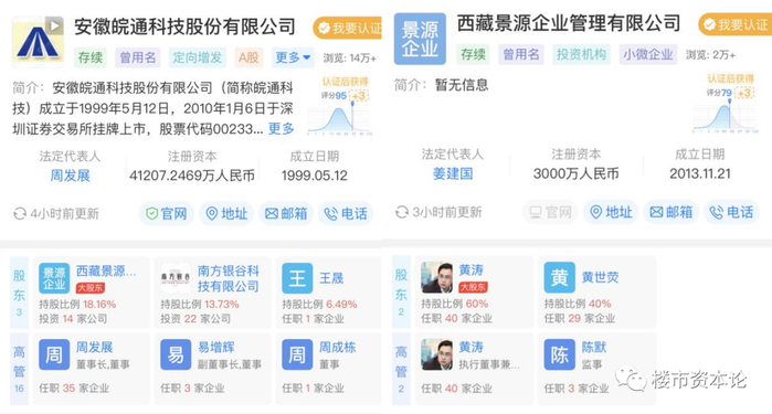 西藏景源的实际控制人正是黄涛、黄世荧两兄弟。自2020年3月,皖通科技内斗激化,原控股股东南方银谷实控人被罢免上市公司董事长职务。几乎同一时刻,黄氏家族的西藏景源举牌皖通科技。在随后的皖通科技资本争夺战中,西藏景源不断增持,直到最近显示占股18.16%,已成为皖通科技第一大股东。