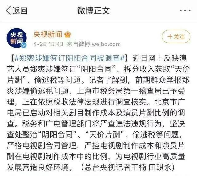4月28日下午6点43分,央*视-新&闻发出重磅消息:郑爽涉嫌签订阴阳合同被上海市税务局正式调查。