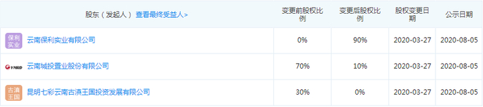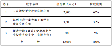 2016年底,云南省城投集团(现已更名“云南康旅集团”)旗下上市房企云南城投置业增资8400万元,占股70%;2018年4月,云南城投出售5%股份引入“资方”国寿云城康养产业基金。