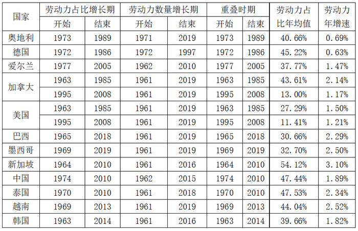 选取欧洲的奥地利、德国、爱尔兰三个国家分析潜在的“人口红利机会窗口”,可以看到三者的重叠时期分别为1973-1989、1972-1986、1977-2005年,期间的劳动力占比年均值都比较高,都在35%以上,但是从劳动力数量增速来看,除了爱尔兰比较高,1.47%左右外,其余两个国家的年增速都在1%以下,总体“人口红利机会窗口”不明显。