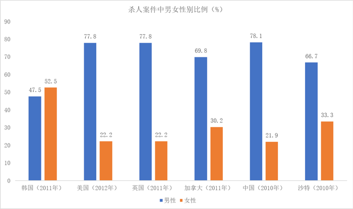 以暴力案件中较为严重的杀人案的被害人比例来看,韩国是世界上少见的女性被害人占比高于男性的国家。