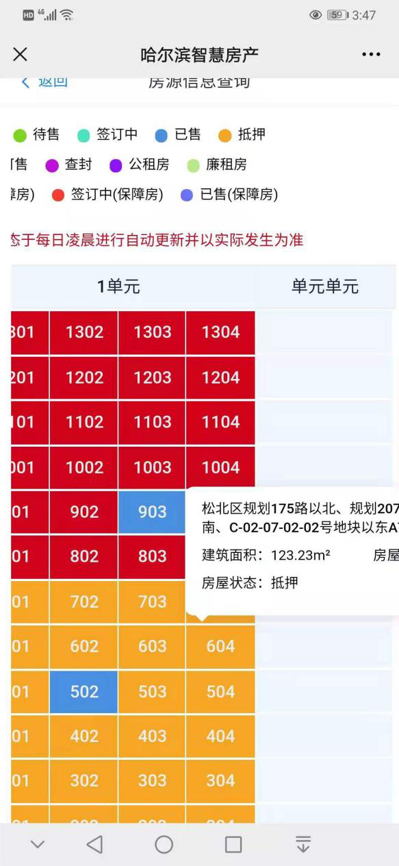 5月17日,记者从哈尔滨市住建局推出的线上查询系统发现,珍宝岛•健康城项目中包括华君、郝佟等人购买的诸多房源均显示处于抵押状态。