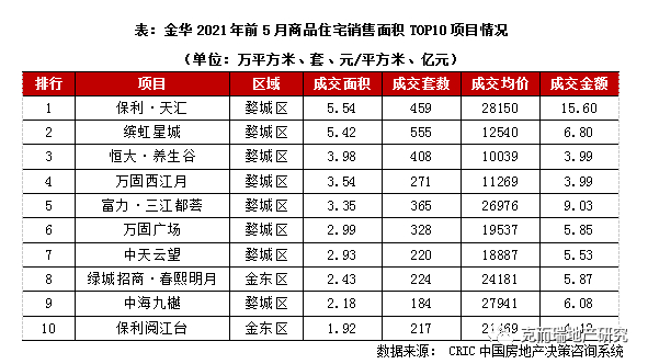 依据CRIC监测的2021年1-5月商品住宅销售面积TOP10项目情况,可以看到,8成项目集中在婺城区,刚需、高端两头翘,既有均价在10000元/平的缤虹星城、恒大·养生谷、万固西江月;也不乏高端改善的保利天汇、富力·三江都荟、中海九樾,开盘当天去化率基本都在7-8成。