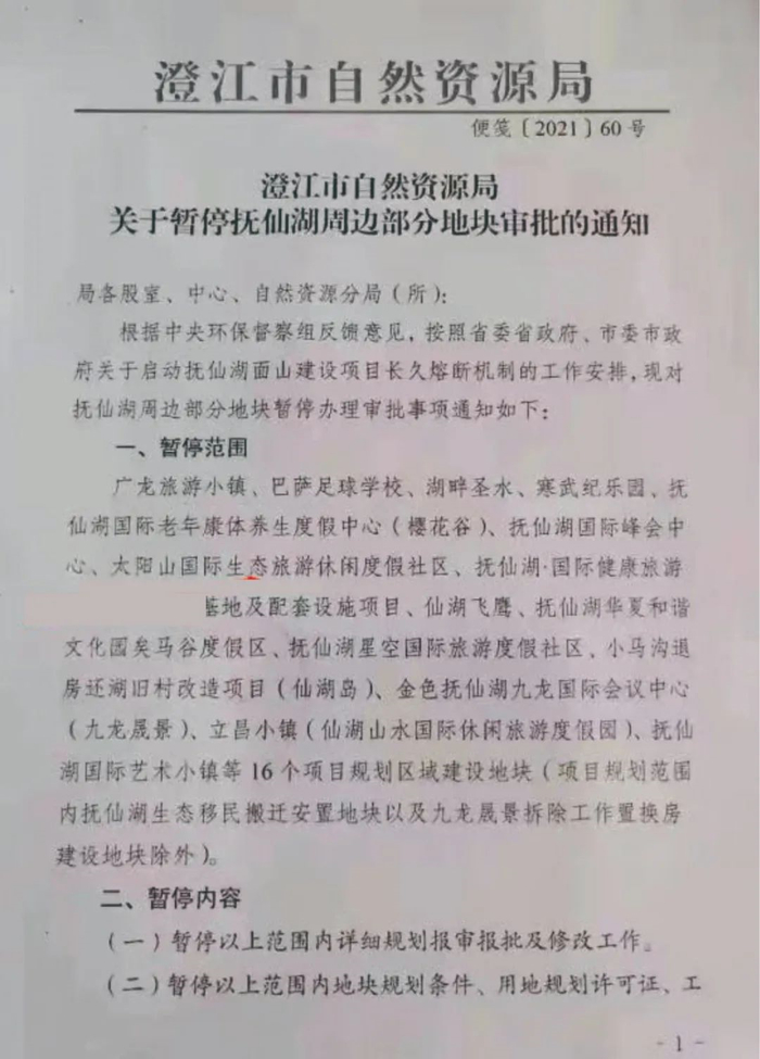 6月11日,玉溪市辖区内的澄江市自然资源局发布《关于暂停抚仙湖周边部分地块审批的通知》,涉及项目数达16个之多,包括广龙旅游小镇、湖畔圣水、抚仙湖国际峰会中心、樱花谷、太阳山国际生态旅游悠闲度假社区、抚仙湖国际健康旅游谷、抚仙湖华夏和谐文化园矣马谷度假区、抚仙湖星空国际旅游度假社区、仙湖岛、九龙晟景、立昌小镇、抚仙湖国际艺术小镇等。